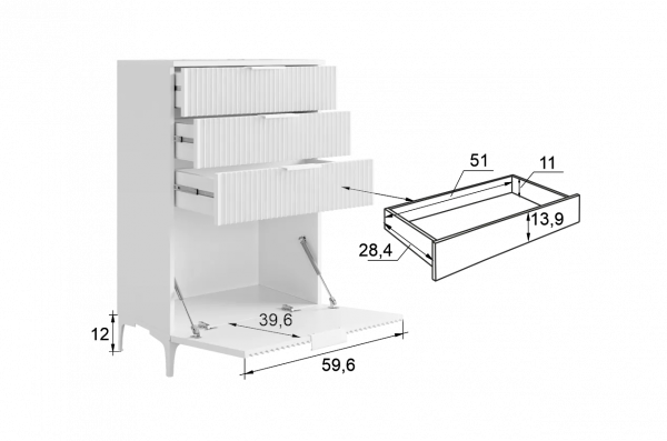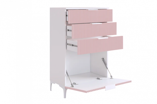 Комод «Зефир» — идеальное решение для детской и гостиной комнат. Он оснащён выкатными ящиками и откидной секцией, обеспечивая максимальный комфорт и удобство использования. Фасады украшены изящной фрезеровкой, которая придаёт изделию неповторимый шарм и элегантность.