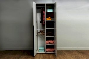 Шкаф оснащён длинными пластиковыми ручками и имеет удобное внутреннее наполнение: слева расположены полки, а справа — две штанги для вешалок. Это позволяет рационально использовать пространство и разместить различные типы одежды.