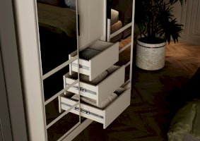 Шкаф включает отделения для верхней одежды со створками-купе на алюминиевых направляющих, обеспечивающими плавное и бесшумное открывание/закрывание. Внутри — полки, штанги для одежды и нишевые пространства для хранения белья, что позволяет организовать вещи максимально удобно.