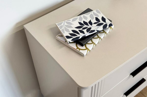 Комод изготовлен из качественных материалов: корпус выполнен из ЛДСП, что гарантирует прочность и долговечность, а фасад, выполненный из МДФ в плёнке ПВХ, не только выглядит эстетично, но и защищает комод от повреждений. Особое внимание заслуживает фрезеровка фасадов, которая придаёт изделию изысканный вид.